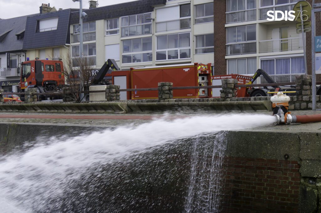 À Fécamp, un parking souterrain a été entièrement inondé (voir photos). Une opération de reconnaissance a été immédiatement conduite pour écarter tout risque humain, suivie de la mise en sécurité d’un dispositif de pompage spécifique, installé par les équipes du Sdis 76.