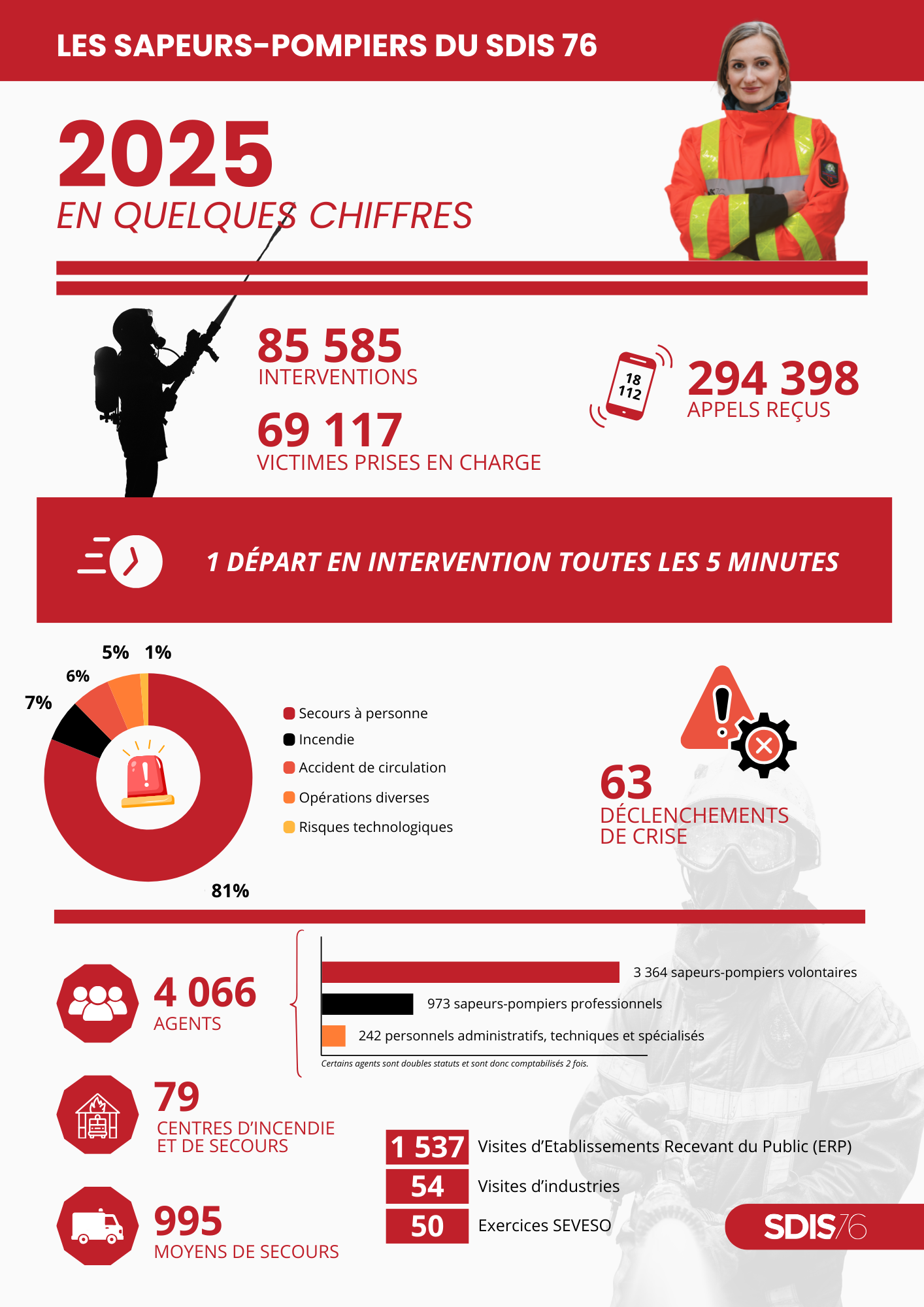 En 2025, le Sdis 76 a réalisé 85 585 interventions pour porter secours sur l’ensemble du territoire seinomarin. Cela représente 69 117 victimes prises en charge par les sapeurs-pompiers. Le centre de traitement de l’alerte a, quant à lui, réceptionné 294 398 appels. Pour assurer cette mission essentielle de sécurité civile, le Sdis 76 s’appuie sur 4 066 agents et un maillage territorial de 79 centres d’incendie et de secours. L’ensemble est soutenu par un parc opérationnel de 995 moyens de secours, garantissant réactivité et proximité sur le terrain.